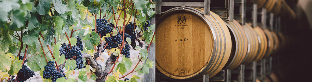 徹底的に収穫量の管理を行い、育成するブドウ房を厳選することで、地中からの栄養分が豊富に行き届くようにしています。また収穫後のブドウ房への気温上昇による損傷を防ぐため、気温が低い早朝から行い、機械を使用することなく” 1房1房 ” 丁寧に手摘みで収穫を行います。 完全に温度湿度の管理された最適な環境下で瓶詰めまでの熟成期間を経過させ、使用する樽にもこだわりをもって生産しています。
